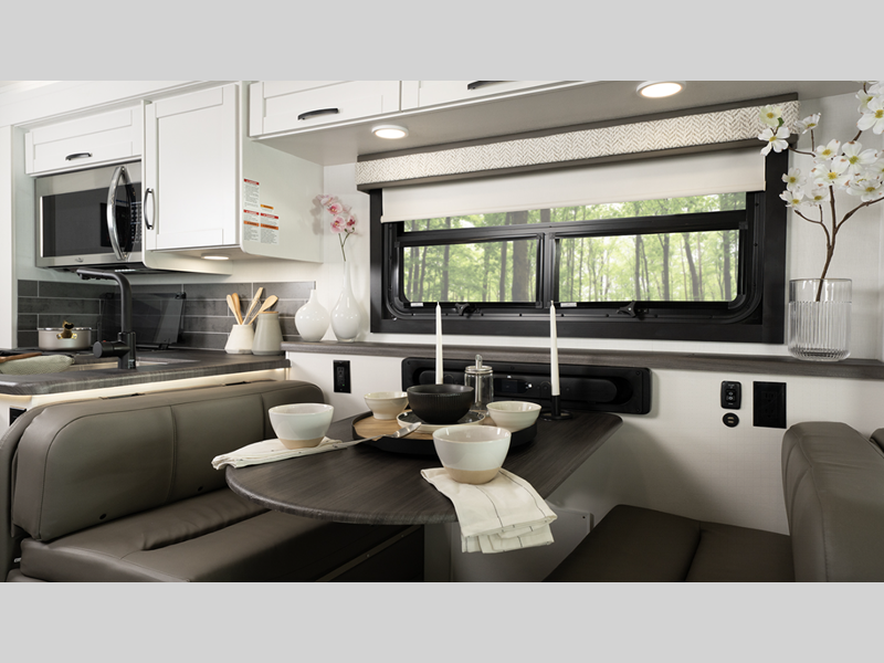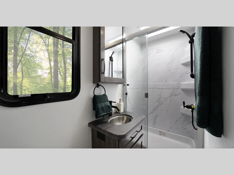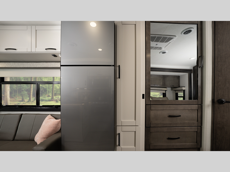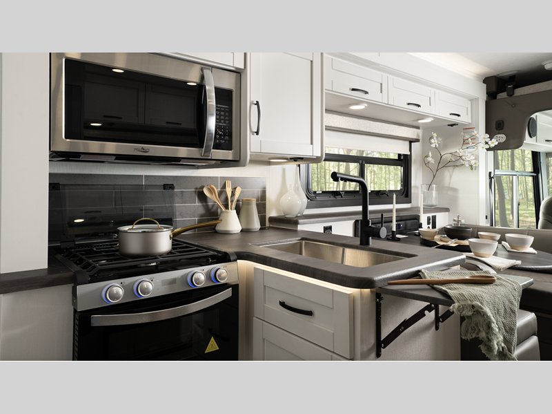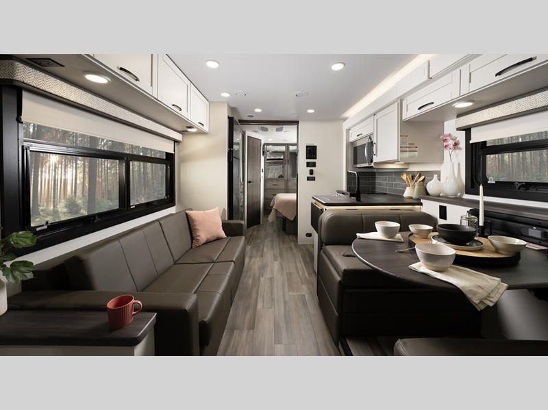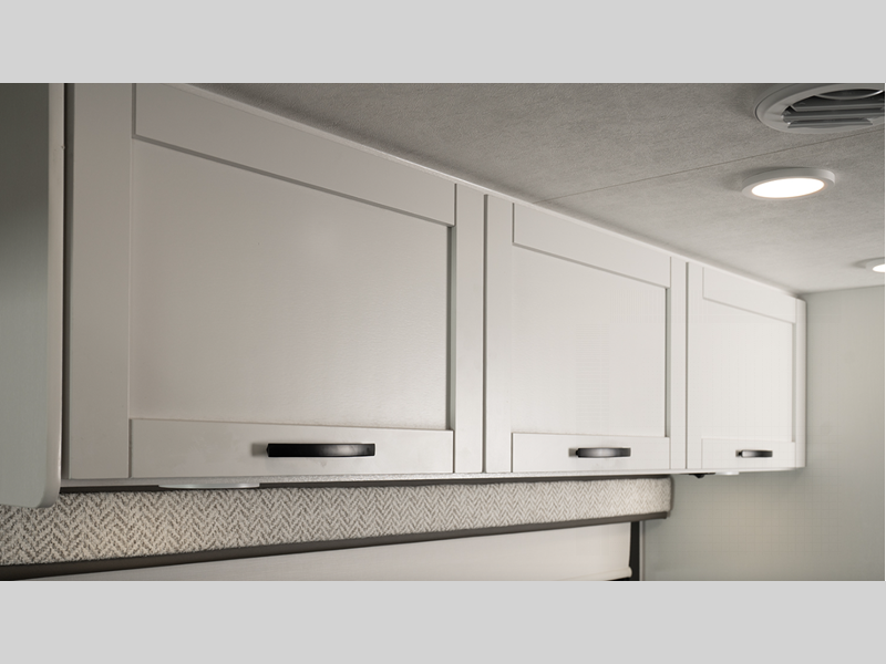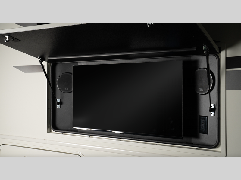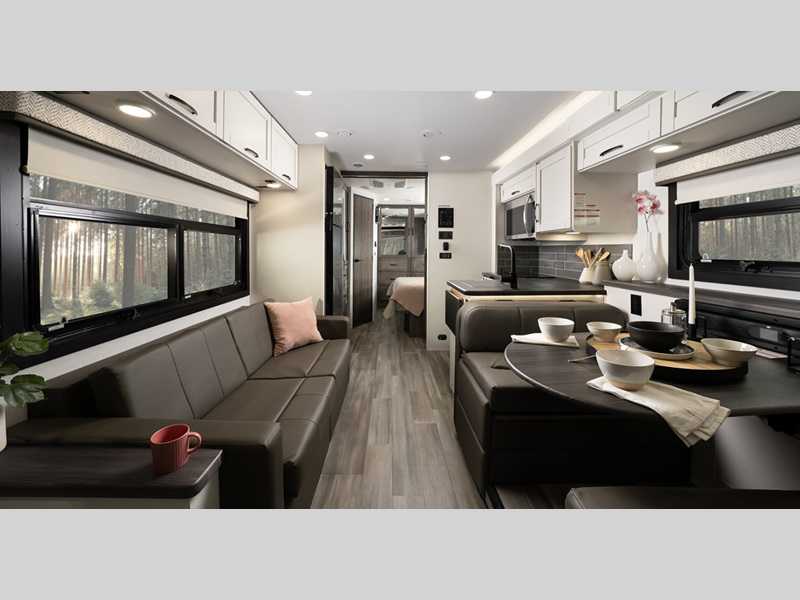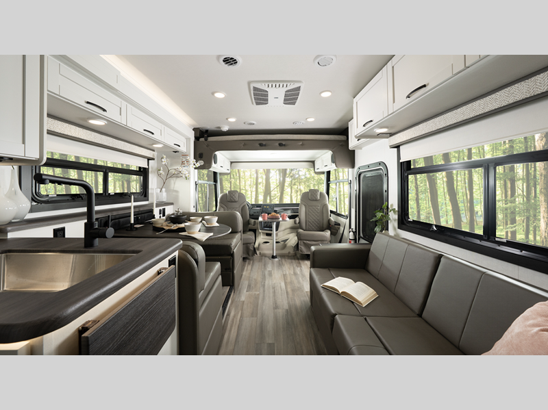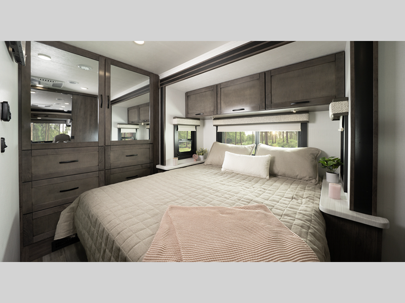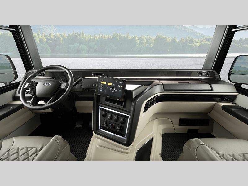 Each coach is built on a Ford F53 chassis, and includes a StrongholdVBL roof, floor and sidewalls, a one-piece, seamless, fiberglass front cap, four-wheel anti-lock brakes, a 5,000 lb. rear hitch receiver. The 120-inch panoramic windshield along with the vinyl graphics provides great views on the road and turned heads when entering the campgrounds. Inside, you will appreciate the hardwood cabinet doors, drawers and fascia with LED accent lighting, two air conditioners with energy management system and standard 200W solar panel with dual controller and second house battery.