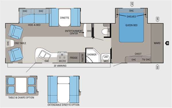 Double Slide Eagle Travel Trailer, Rear Living Area w/2 Chairs, Hide-A-Bed w/Air Mattress/Booth Dinette Slideout, Entertainment Center, Dbl. Kit. Sink, 3 Burner Range w/Micro., Refrig., Pantry, Private Toilet Area, Angle Shower, Lav. w/Med. Cab., Front Queen Bed w/Shelves Slideout, Wardrobe, TV Cabinet & Chest, Overhead Cabinets Throughout, 20' Awning and More! Available Options May Include: Free Standing Table w/Chairs, Extend. Dinette